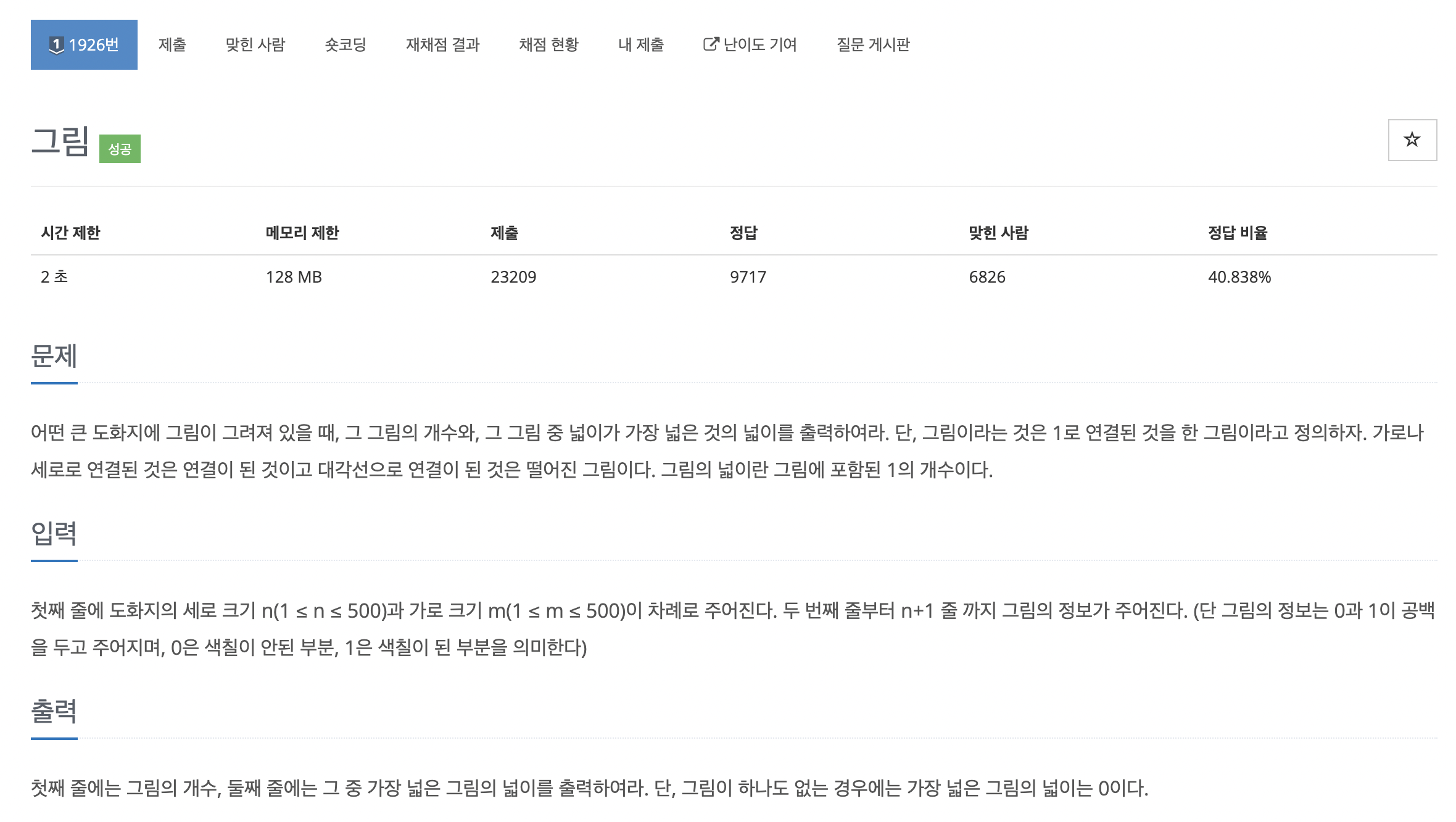 1926번 그림 문제는 0과 1로 이루어진 그래프에서 상하좌우가 1로 연결된 그림을 찾아 그 갯수와 그 그림들 중 가장 넓은 넓이를 출력하는 문제이다.