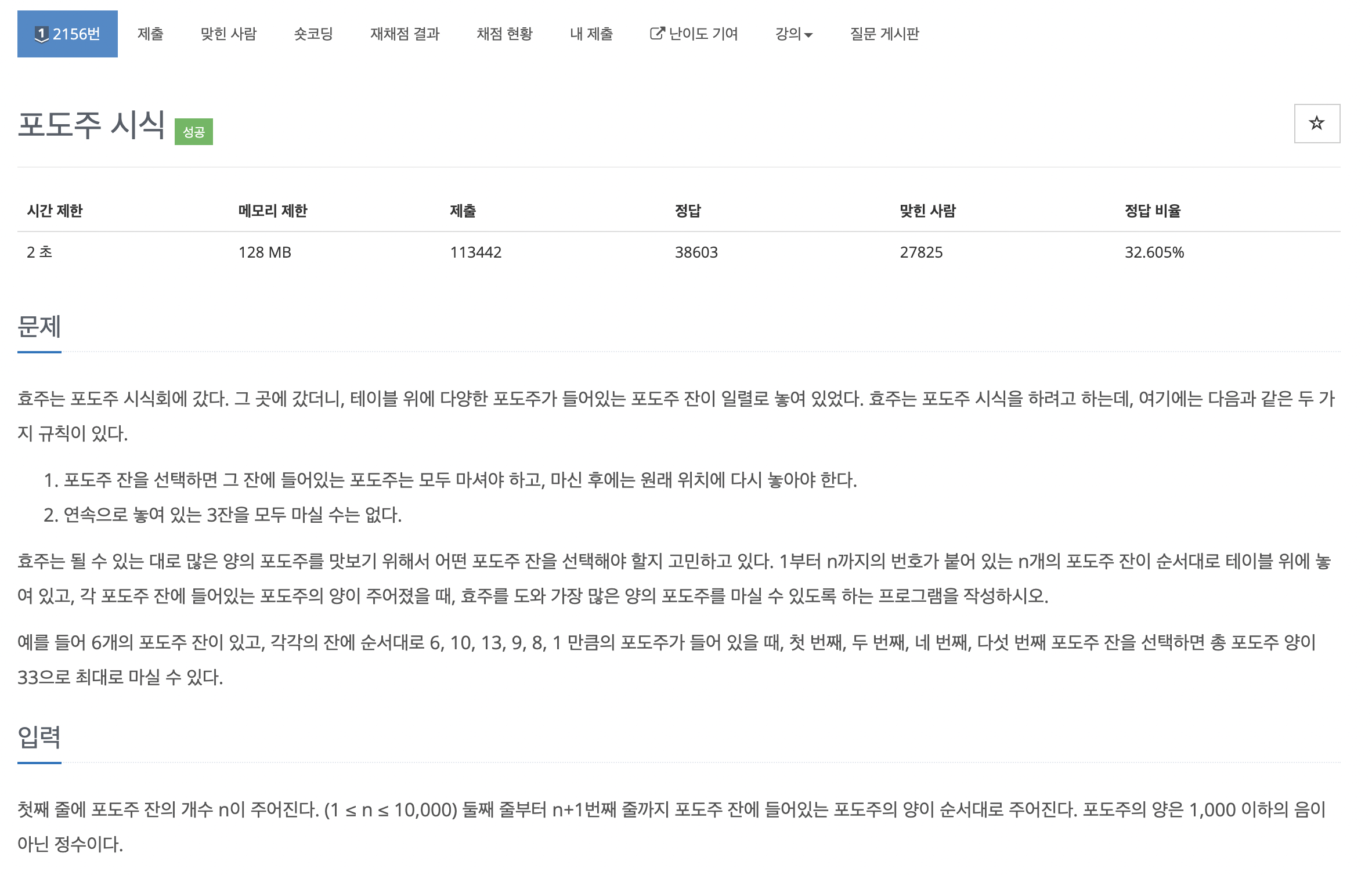 연속으로 포도주 잔을 선택하는 문제인데 연속으로 2잔만 마실 수 있고 여러 경우 중 최선의 값을 구한다는 점에서 Dynamic Programming 알고리즘 문제라는 점을 알아낼 수 있었다.