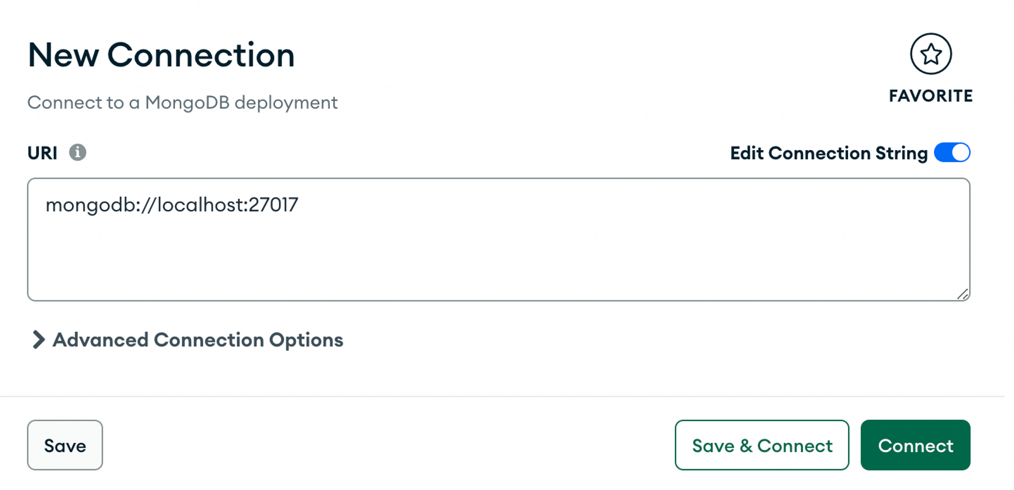 MongoDB Compass를 실행후 다음과 같은 URI를 입력해준 후 좌측 하단에 Connect 버튼을 클릭하여 DB에 연결한다.