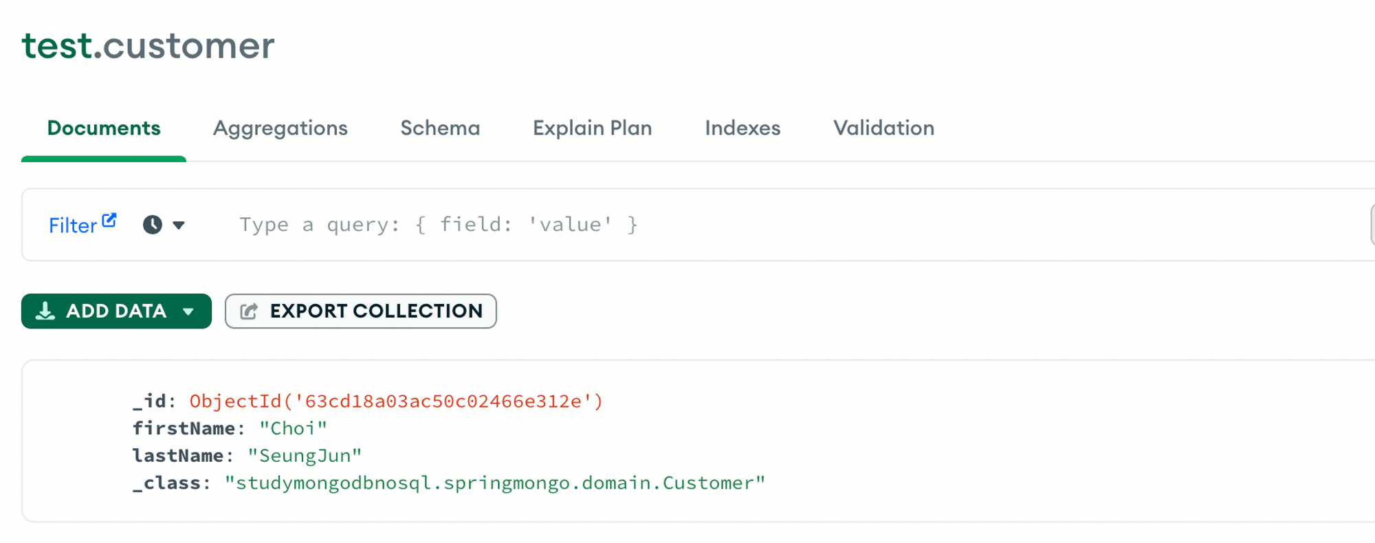 유저의 성(firstName)과 이름(lastName)을 갖는 Customer 도큐먼트를 정의합시다. DB에 저장될 document의 이름은 @Documemt 애노테이션을 통하여 지정해줍니다. MongoDB의 모든 도큐먼트는 반드시 _id라는 주키를 갖게 됩니다. @Id 애노테이션은 해당 필드에 대해 주키로 지정하겠다는 의미를 가집니다.