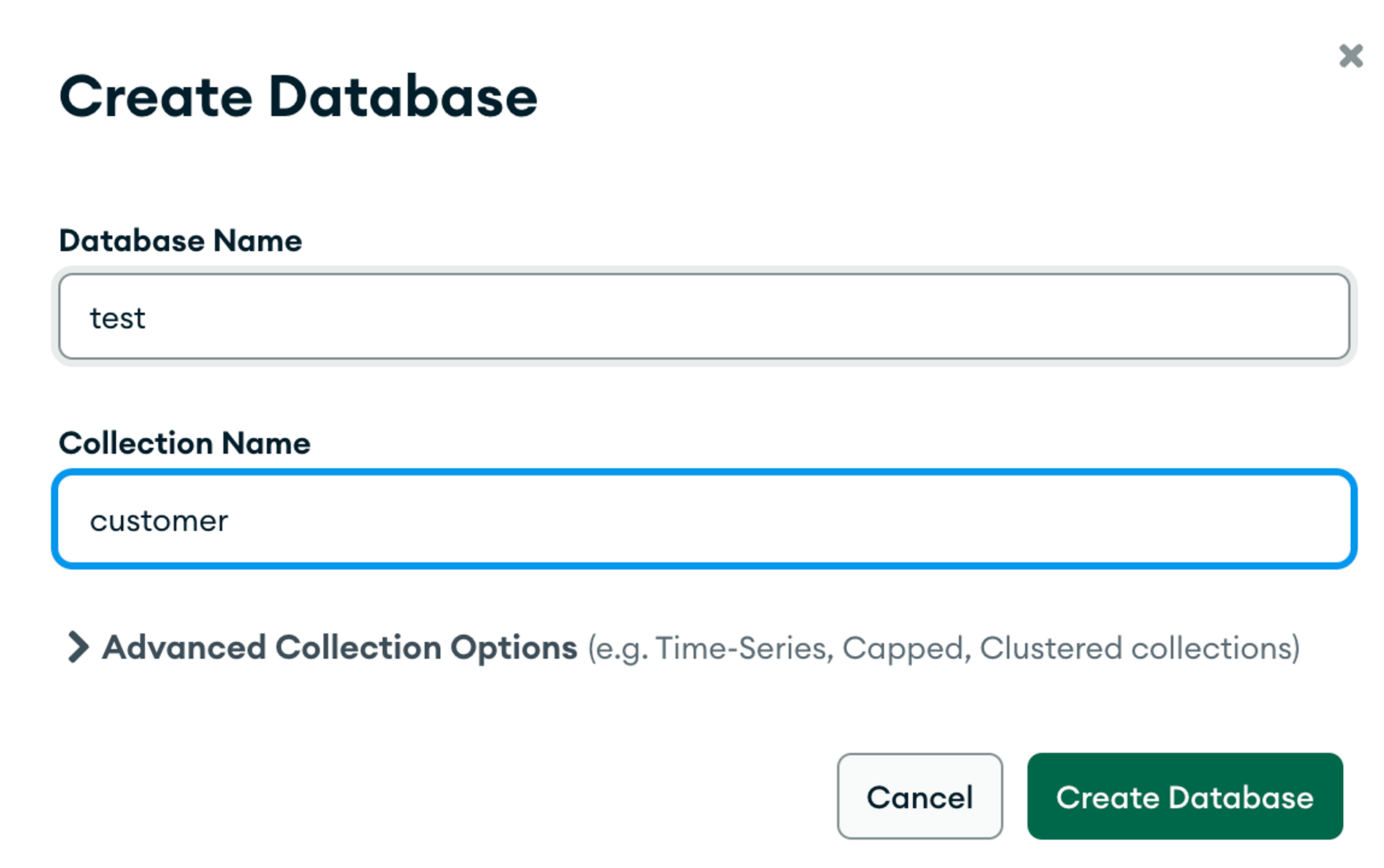사용할 DB이름과 기본 컬렉션(테이블)을 입력하여 하나의 데이터베이스를 생성한다.