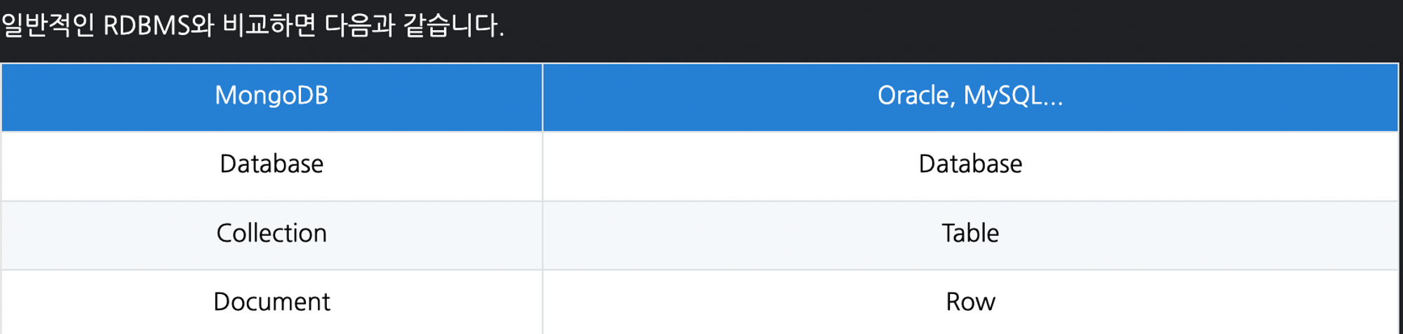 - 장비 확장이 간단함 - JSON 구조 : 데이터를 직관적으로 이해 가능 (JSON 형식의 데이터 구조로 문서(Document)에 저장한다.)