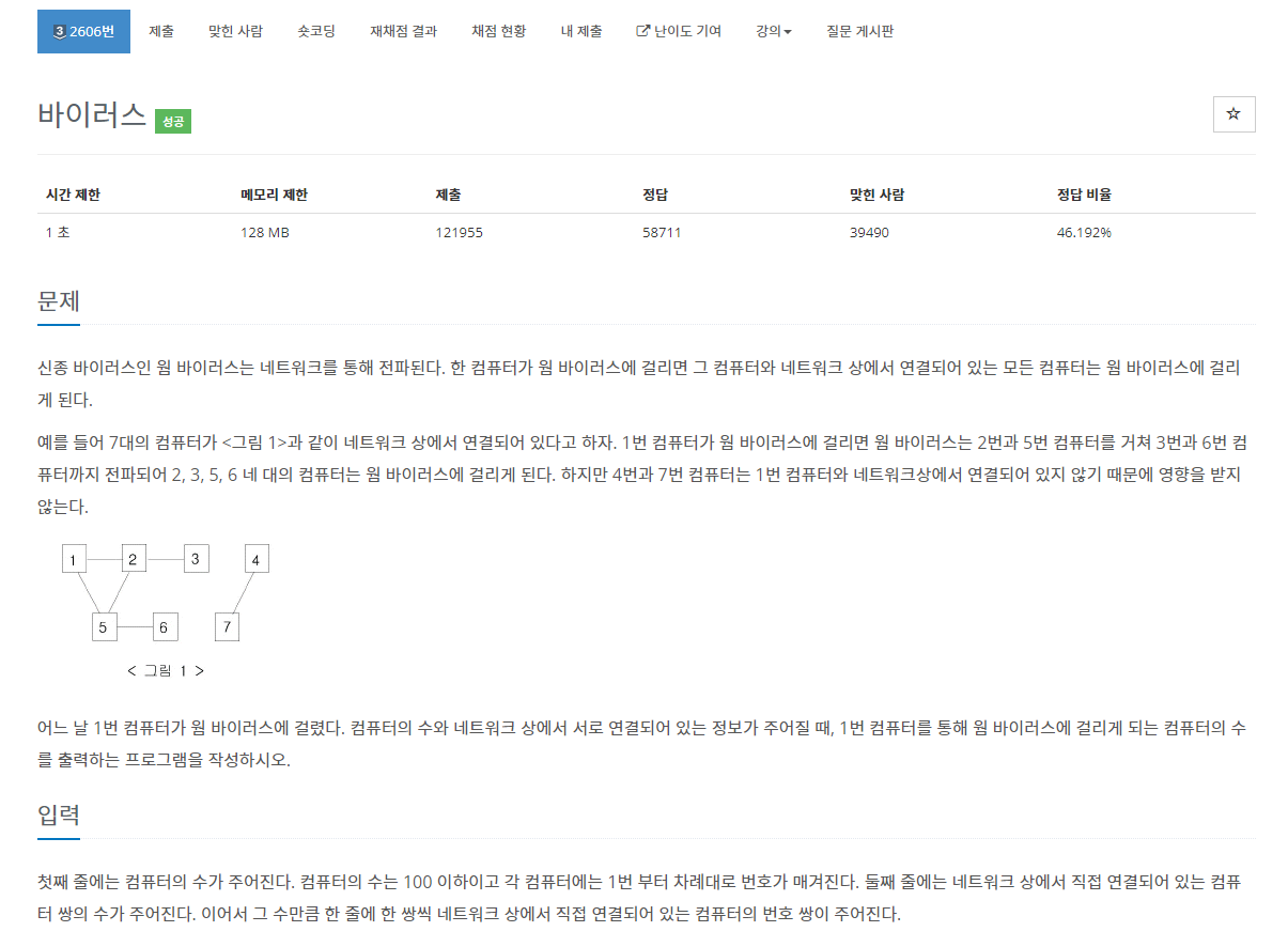 바이러스 문제는 그래프에서 1에 연결되어 있는 노드를 탐색하여 그 갯수를 출력하는 문제이다.