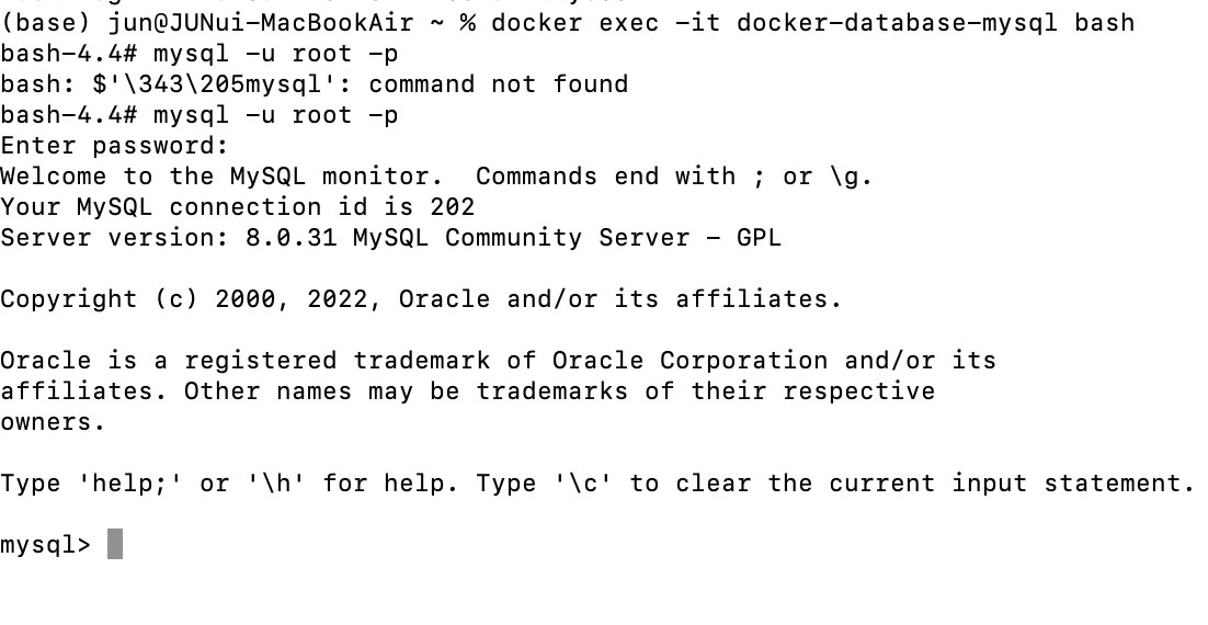 그리고 접속한 MySQL 컨테이너에서 다음과 같은 명령어로 db에 접속하면 된다.