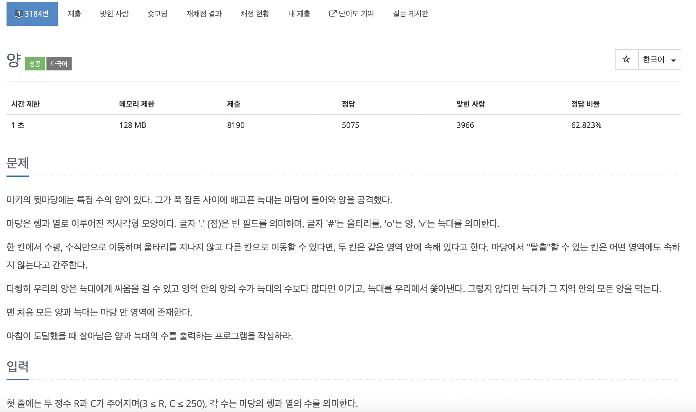 print(result['o'], result['v']) # 살아남은 양의 수와 살아남은 늑대의 수 출력'코딩테스트 > 백준' 카테고리의 다른 글