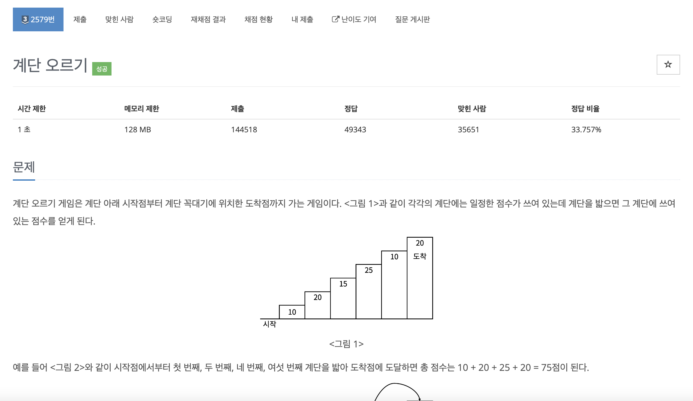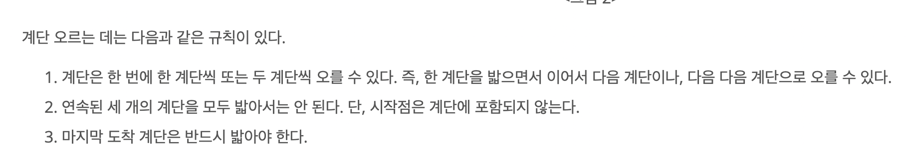 계단 오르기 게임은 계단 아래 시작점부터 계단 꼭대기에 위치한 도착점까지 가는 게임이다. <그림 1>과 같이 각각의 계단에는 일정한 점수가 쓰여 있는데 계단을 밟으면 그 계단에 쓰여 있는 점