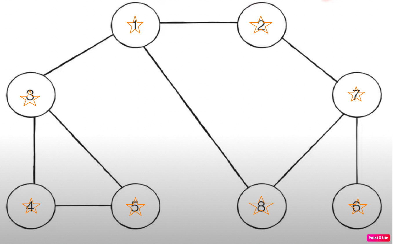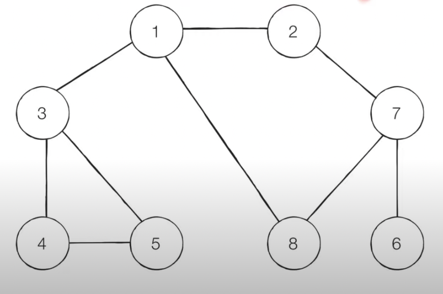 노드1은 2번, 3번, 8번 노드와 연결되어 있었고 2번은 방금 방문하였으니 3번 노드로 이동하게 되며, 그 뒤론 값이 작은 순서대로 4,5번 노드를 방문하며 탐색을 마치게 될 것이다. (8번 노드는 이미 방문하였으므로 skip)