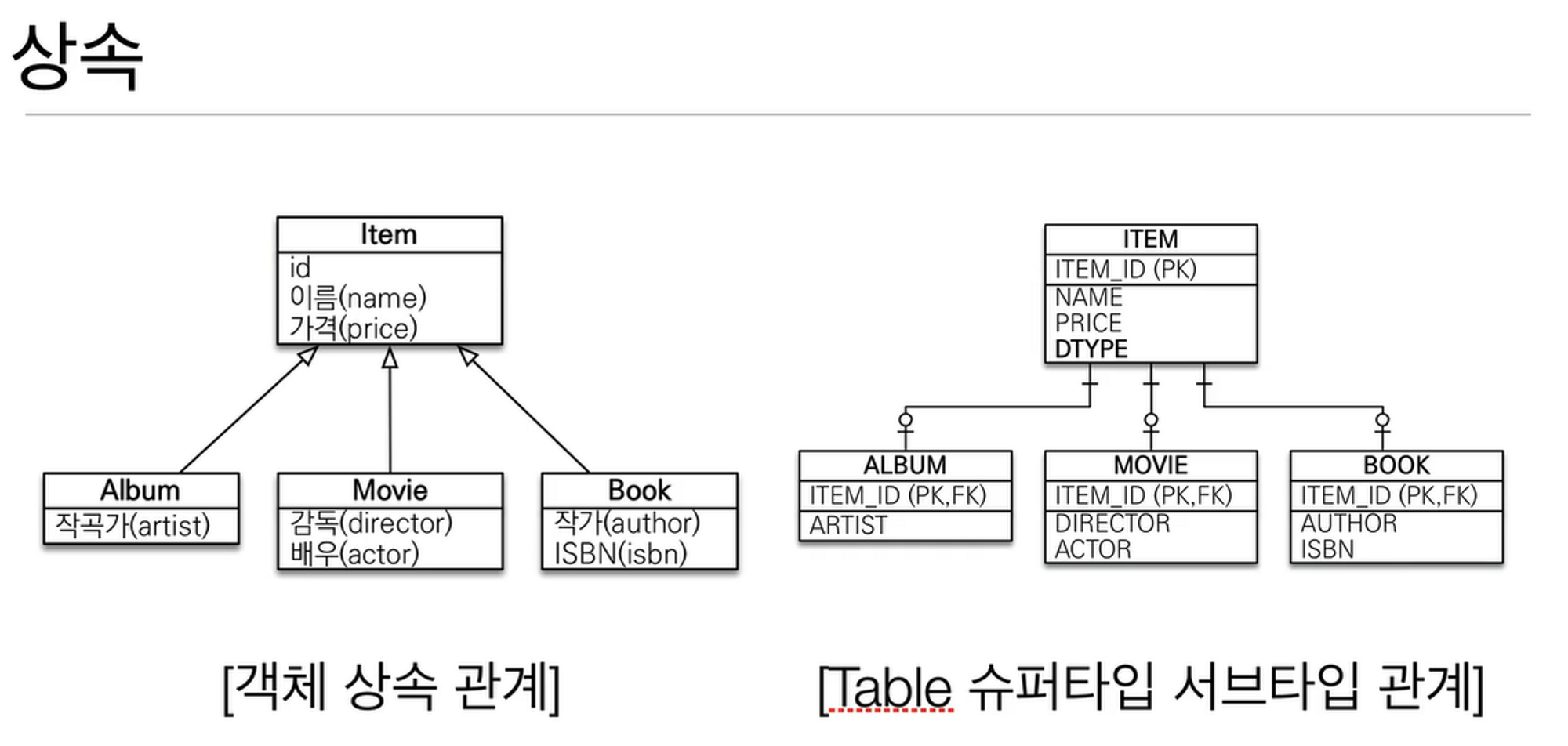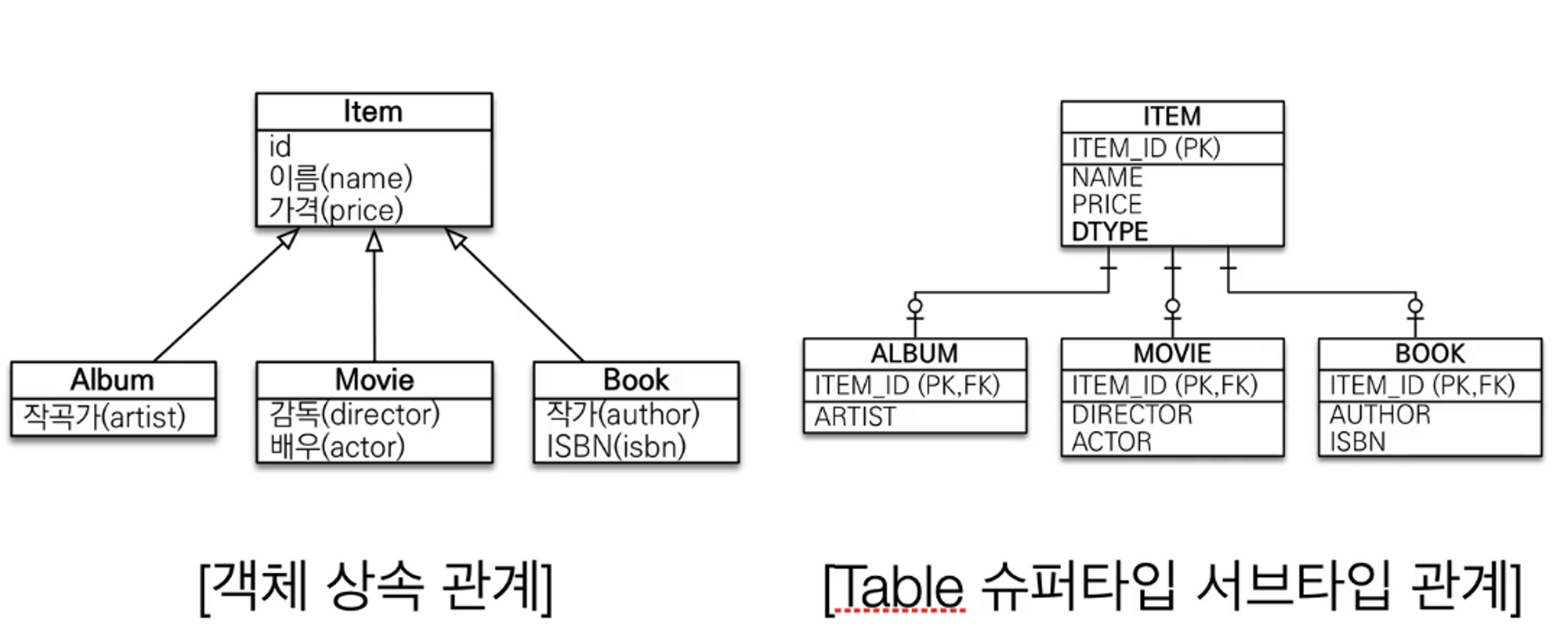 Item이라는 클래스를 상속한 Book, Movie, Album을 테이블에선 슈퍼/서브 타입으로 표현하는 것이다.