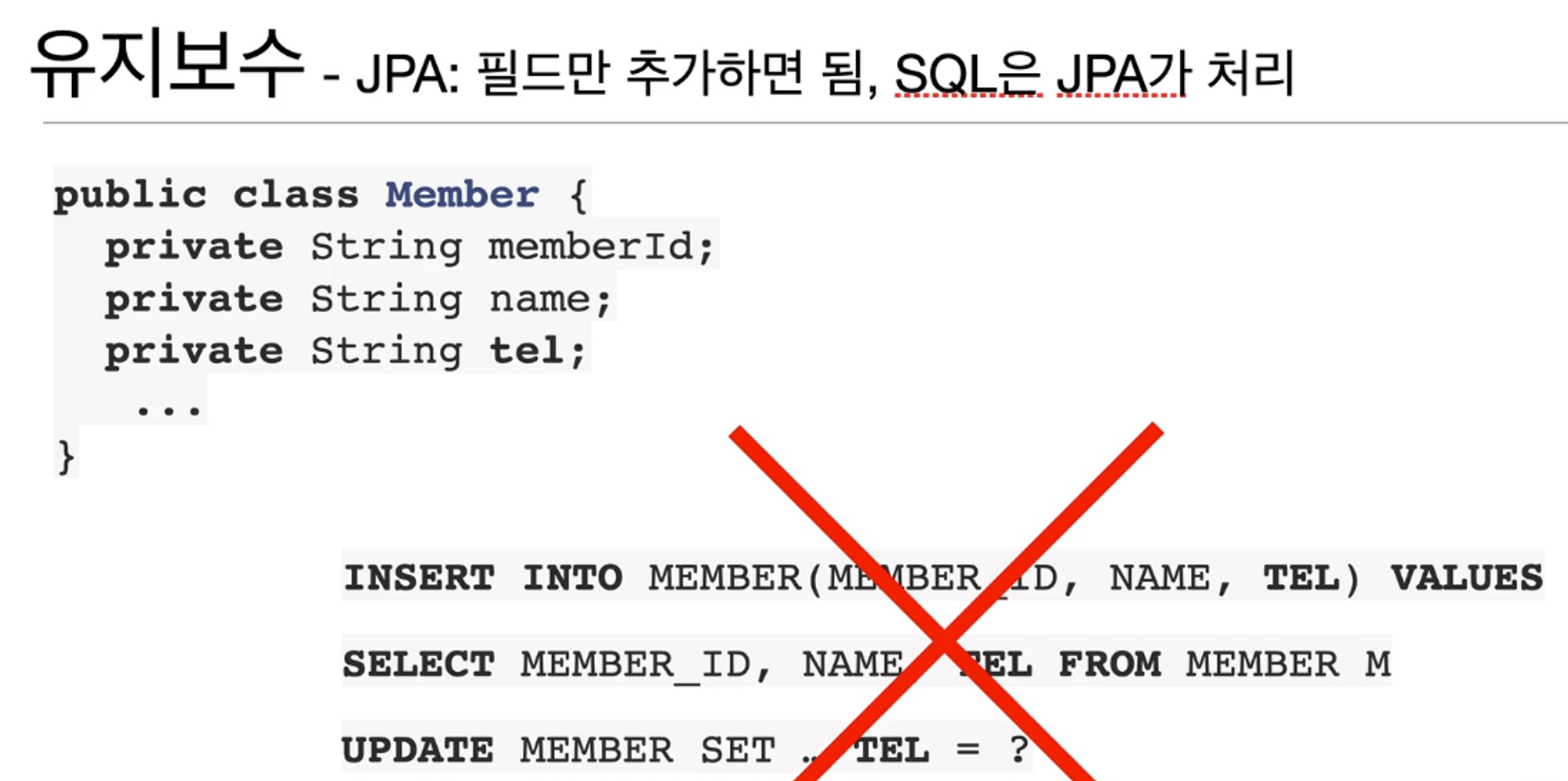 이후 Member 클래스에 tel이라는 맴버 변수가 추가되면 UPDATE 쿼리로 DB 테이블 구조를 변경해주어야함.