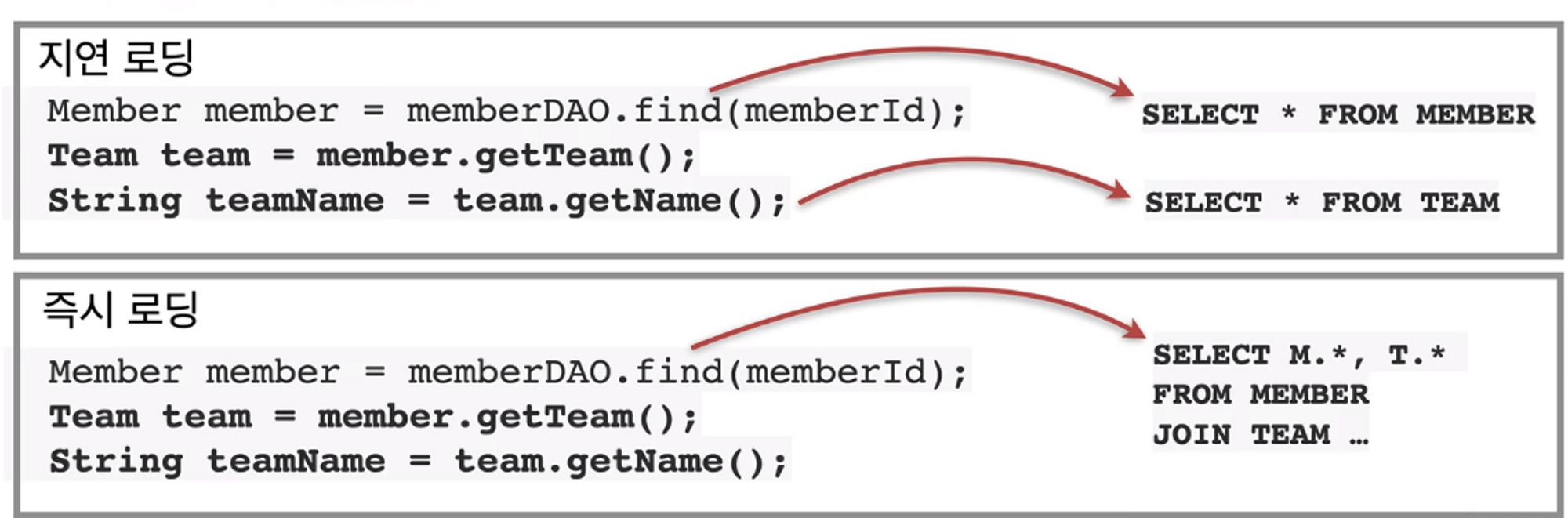 - 즉시 로딩: JOIN SQL로 한번에 연관된 객체까지 미리 조회
