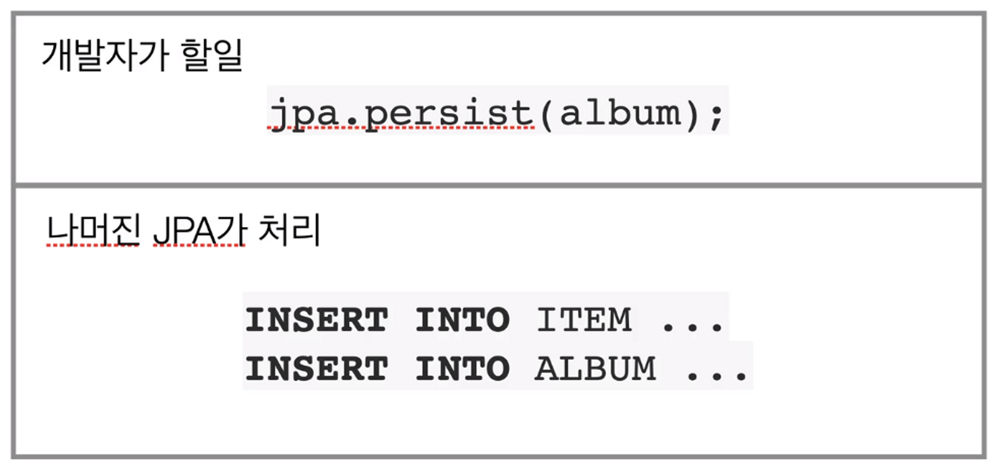 이러한 상황에서 개발자는 jpa의 persist(album); 명령만 사용하면 나머지 Insert 구문은 JPA가 알아서 분석하여 처리한다.