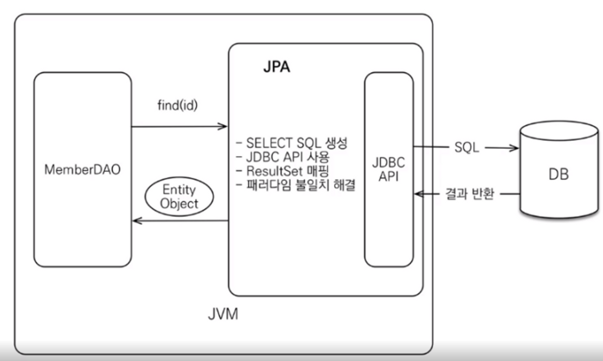 JPA에게 찾고있는 데이터의 id(Primary Key)를 넘겨주기만 하면 SQL 생성, 데이터-객체 매핑, 패러다임 불일치를 해결하여 Entity를 넘겨준다.