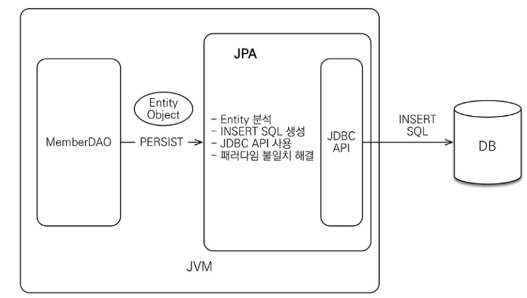 JPA가 Enitity 분석, Insert SQL 생성, JDBC API 사용, 패러다임 불일치 해결을 모두 해준다.