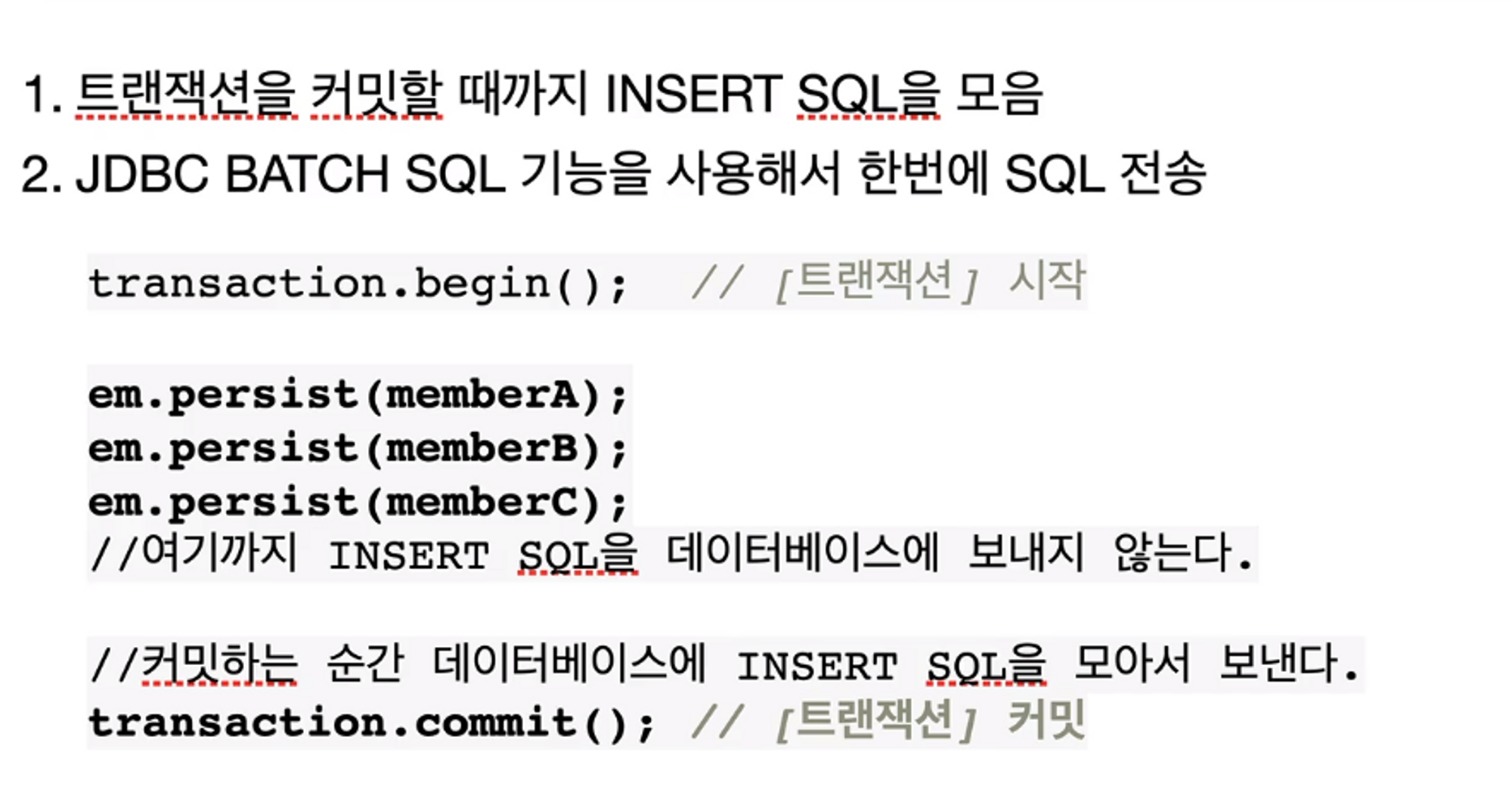 약간의 설정을 거쳐 사용할 수 있는 기술로, 트랜잭션을 커밋할 떄까지 INSERT SQL을 모았다가 JDBC BATCH SQL 기능을 사용하여 트랜잭션 커밋 시에 한번에 SQL을 전송한다.