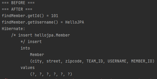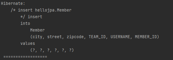 기존에 flush를 따로 수행하지 않았을 때라면 “==============”가 SQL 쿼리 수행 이전에 출력 되겠지만,