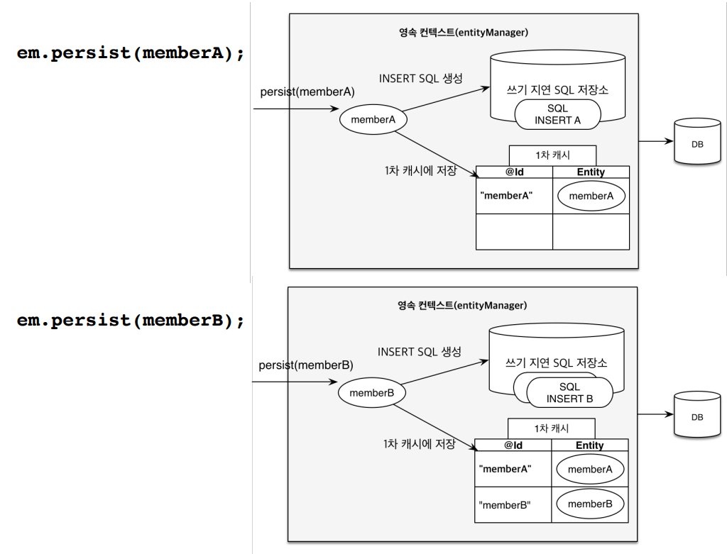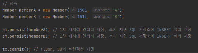 최종적으로 쓰기 지연 SQL 저장소에 memberA, memberB에 대한 INSERT 쿼리 2개가 저장되는 것이다.
