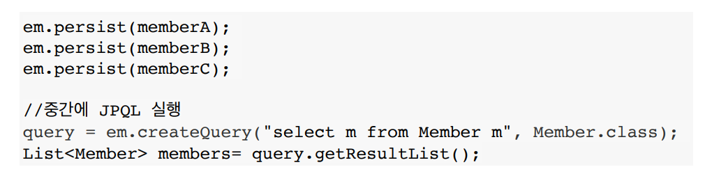 persist로 여러 member를 등록한 뒤 JPQL로 조회했을 때 insert 쿼리는 트랜잭션이 커밋되는 시점에서 실행되기 때문에 아무런 조회 결과도 얻을 수 없다.