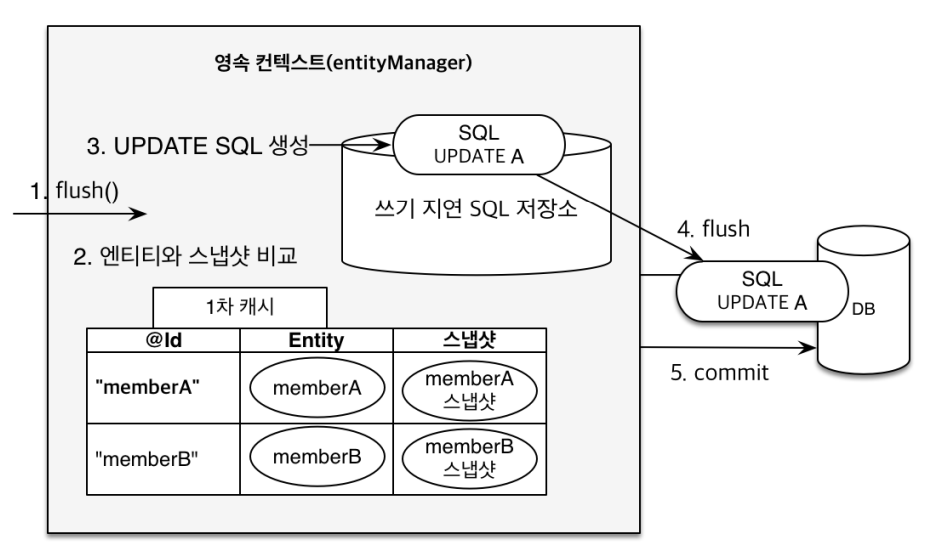 - 만약 엔티티에서 변경 사항이 발견된다면 '쓰기 지연 SQL 저장소'에 update 쿼리를 추가