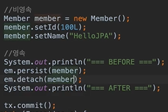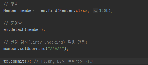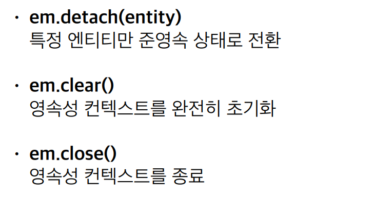 - 영속 상태의 엔티티가 영속성 컨텍스트에서 분리(detached)