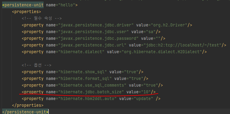 hibernate는 설정에서 위와 같은 batch_size 옵션을 설정을 통해 한번에 커밋하는 배치의 크기 단위를 지정할 수 있다.