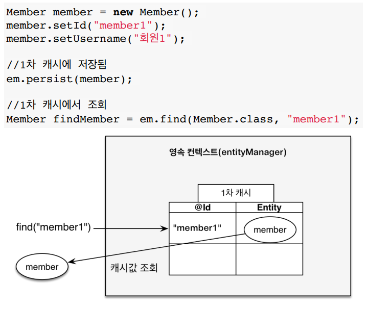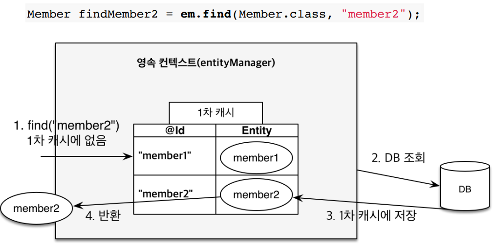 DB를 먼저 찾는 것이 아니라 영속성 컨텍스트의 1차 캐시를 먼저 조회한다.