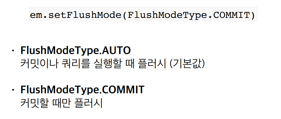 - 트랜잭션을 커밋하는 시점에 내부적으로 flush 가 호출됨.