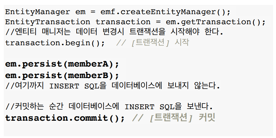 - 트랜잭션이라는 작업 단위가 중요 → DB와 영속성 컨텍스트는 트랜잭션 커밋 직전에만 동기화 하면 됨