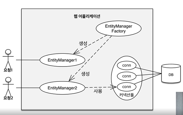 - 클라이언트의 요청이 올때마다 EntityManagerFactory에서 EntityManager를 생성해서 제공한다.