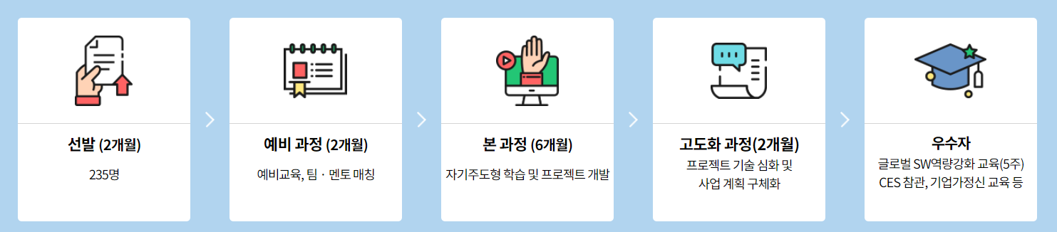 이 4가지 과정을 통해 선발된 인원은 예비 과정과 본 과정, 그리고 고도화 과정을 경험하게 됩니다!