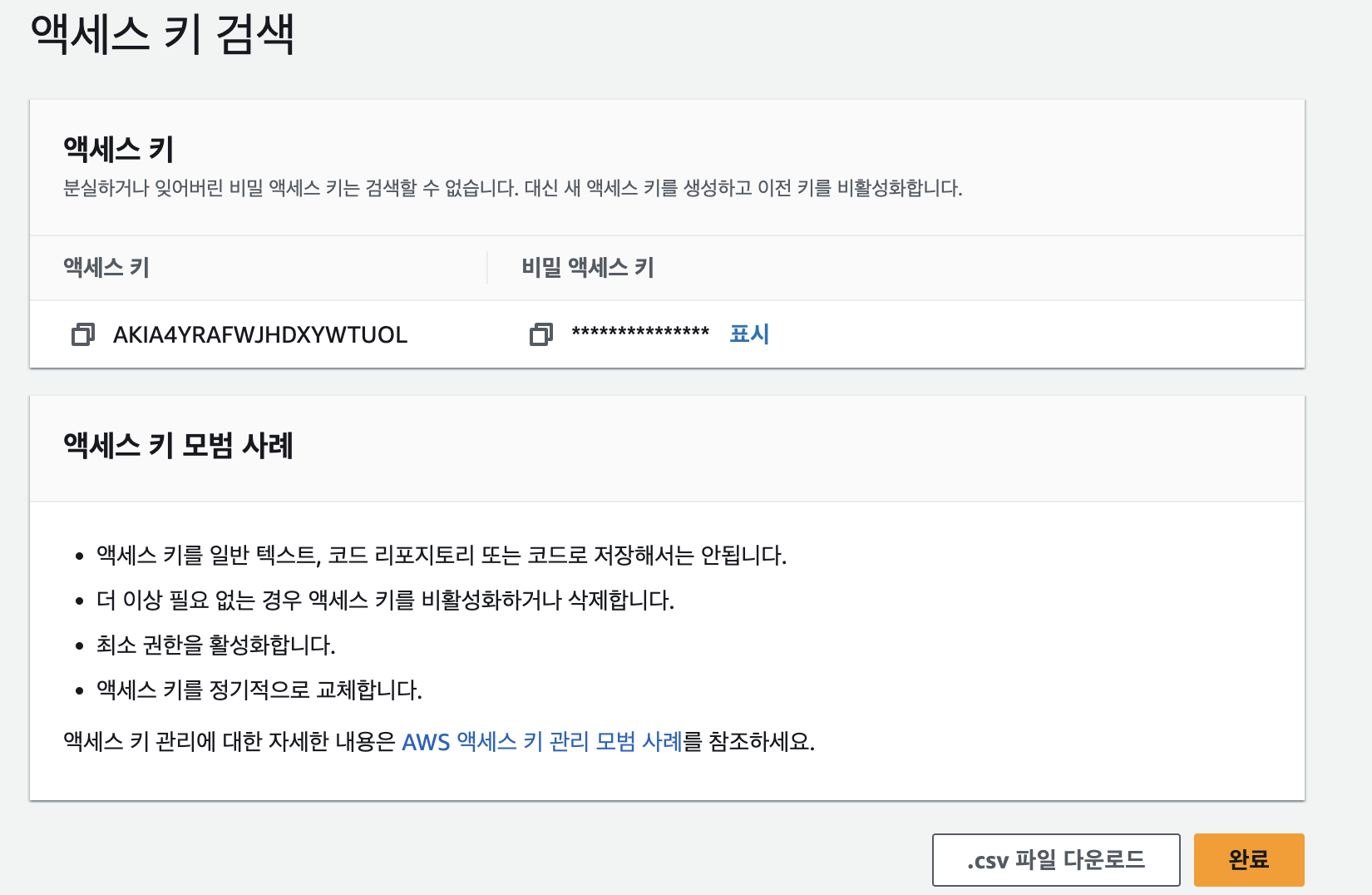 이렇게 생성된 엑세스 키는 ".csv 파일 다운로드" 버튼을 눌러 csv파일로 관리할 수 있습니다.