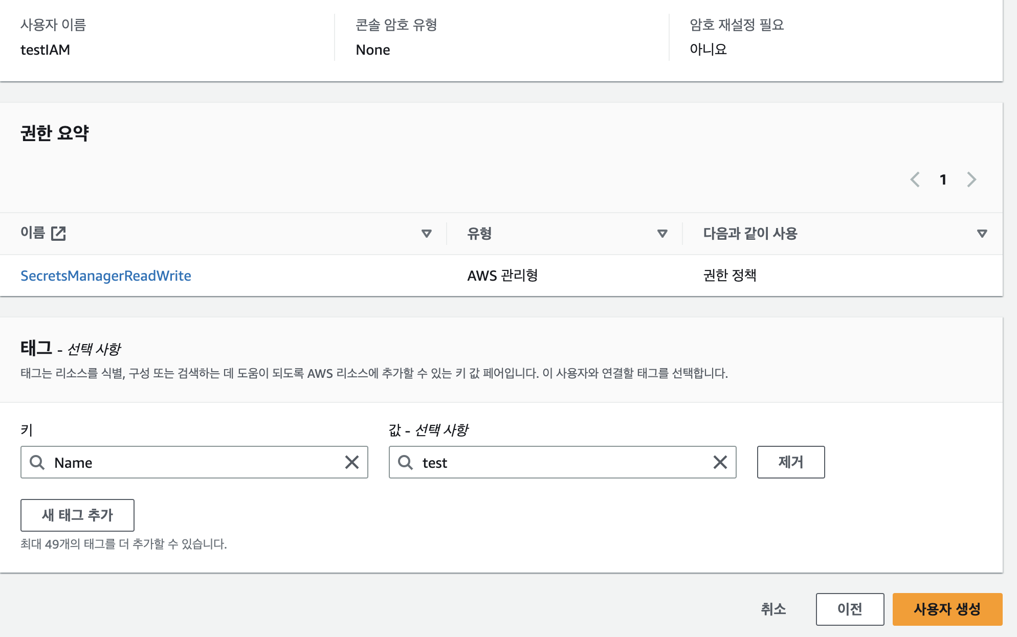 설정이 끝나면 "사용자 생성" 버튼을 클릭합니다.