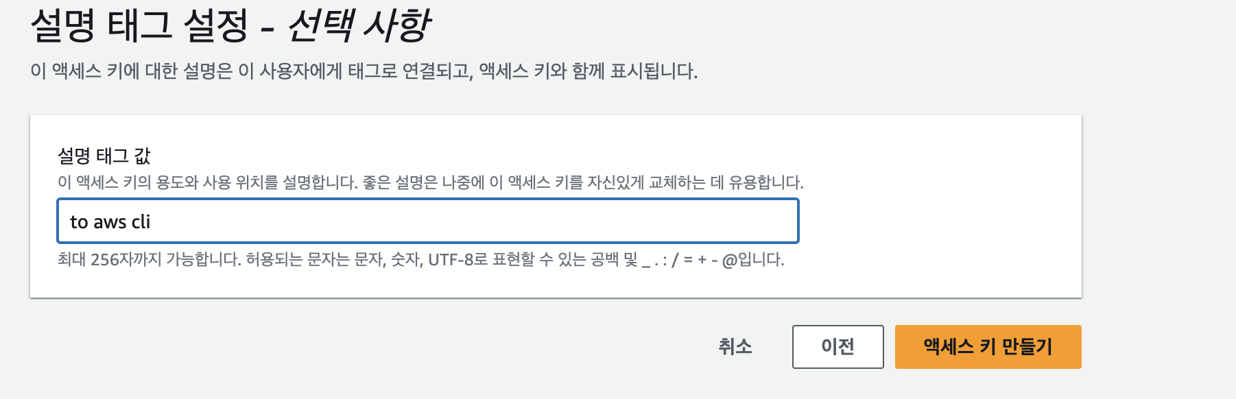 최종적으로 설명 태그의 값을 입력해주면 엑세스 키를 생성할 수 있습니다.