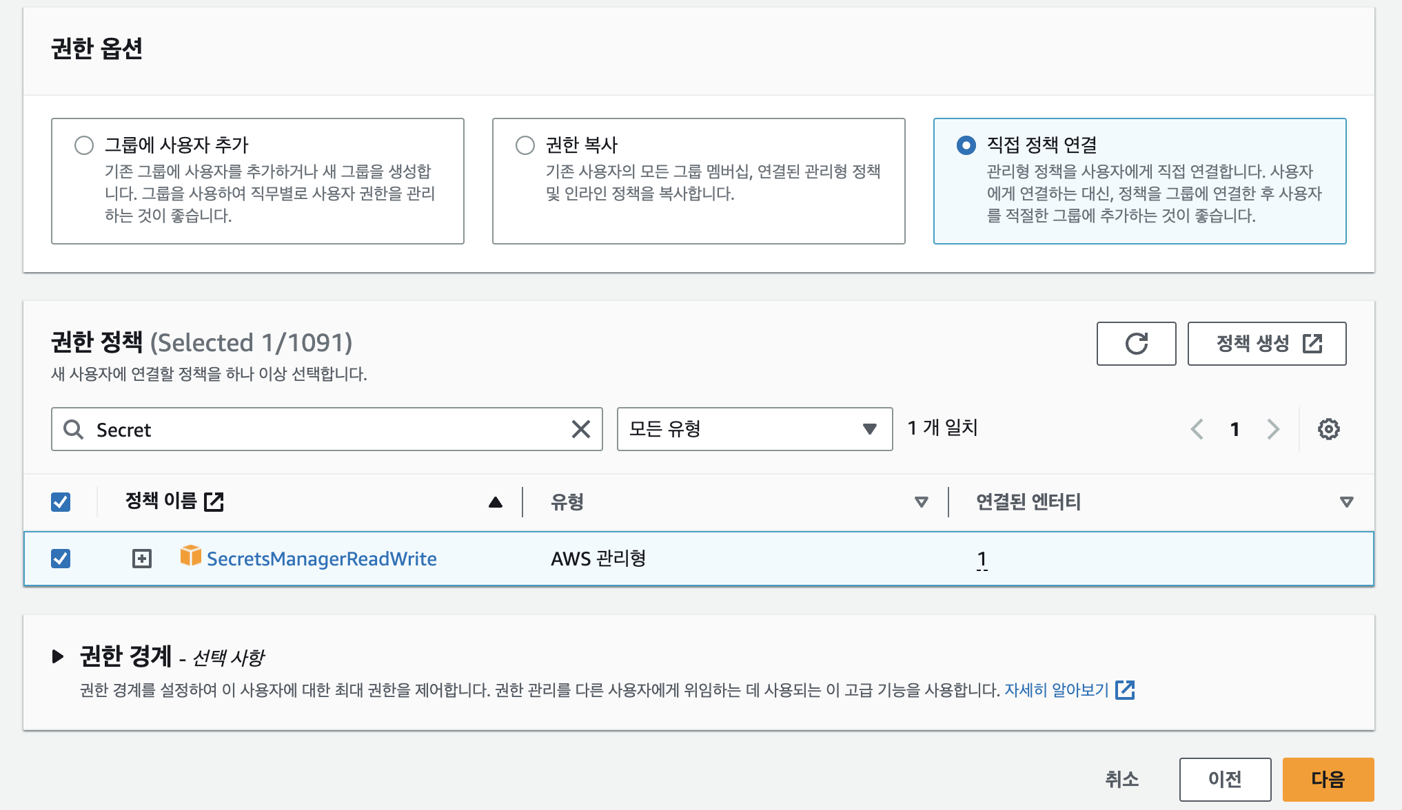 저는 Secrets Manager 사용 권한을 얻기 위해 해당 권한만 가져가겠습니다.
