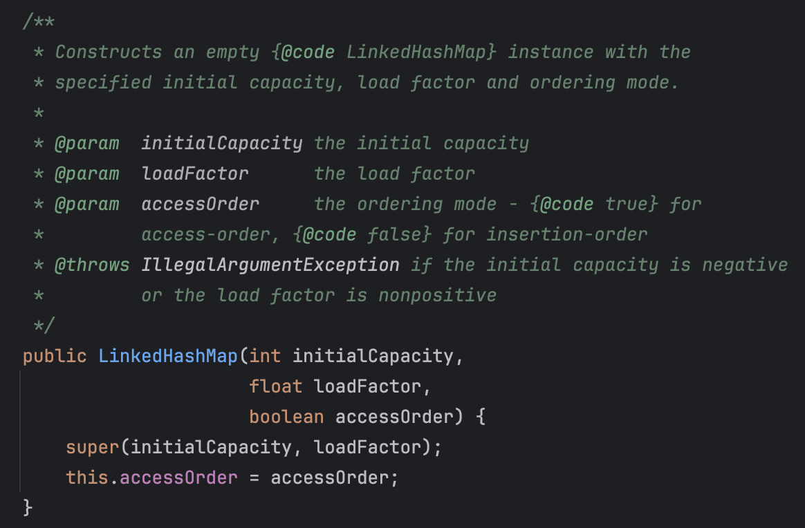 - initialCapacity, loadFactor, accessOrder๋ฅผ ์ ๋ ฅ๋ฐ๋ ์์ฑ์๋ฅผ ํตํด ์ฌ์ฉ ๊ฐ๋ฅํ๋ค.
