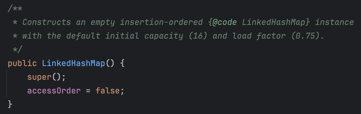 - LHM์ ๊ธฐ๋ณธ ์์ฑ์๋ก ์์ฑํ๊ฒ ๋๋ฉด Ordering Mode ์ค์ ์ ๋ด๋นํ๋ accessOrder๊ฐ false๋ก ์ค์ ๋์ด ์๋์ผ๋ก Insertion-order ๋ชจ๋๋ก ์ค์ ๋๋ค.