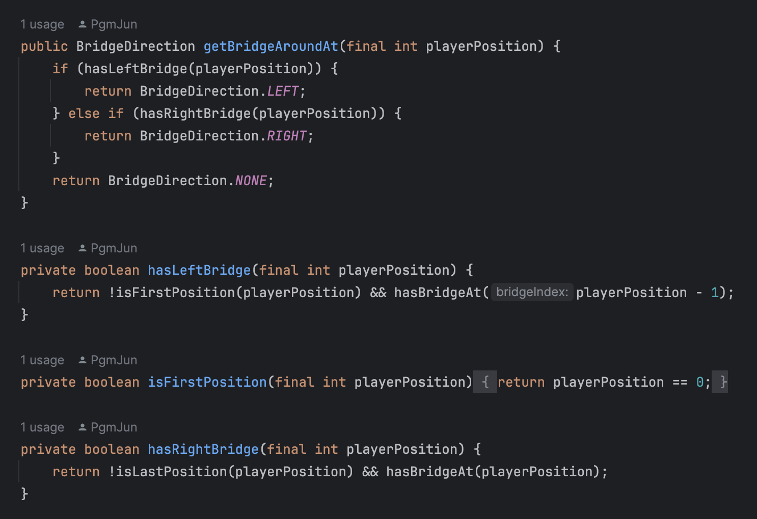 hasLeftBridge() -> isFirstPosition() -> hasRightBridge() 순서대로 사용되고 있다.