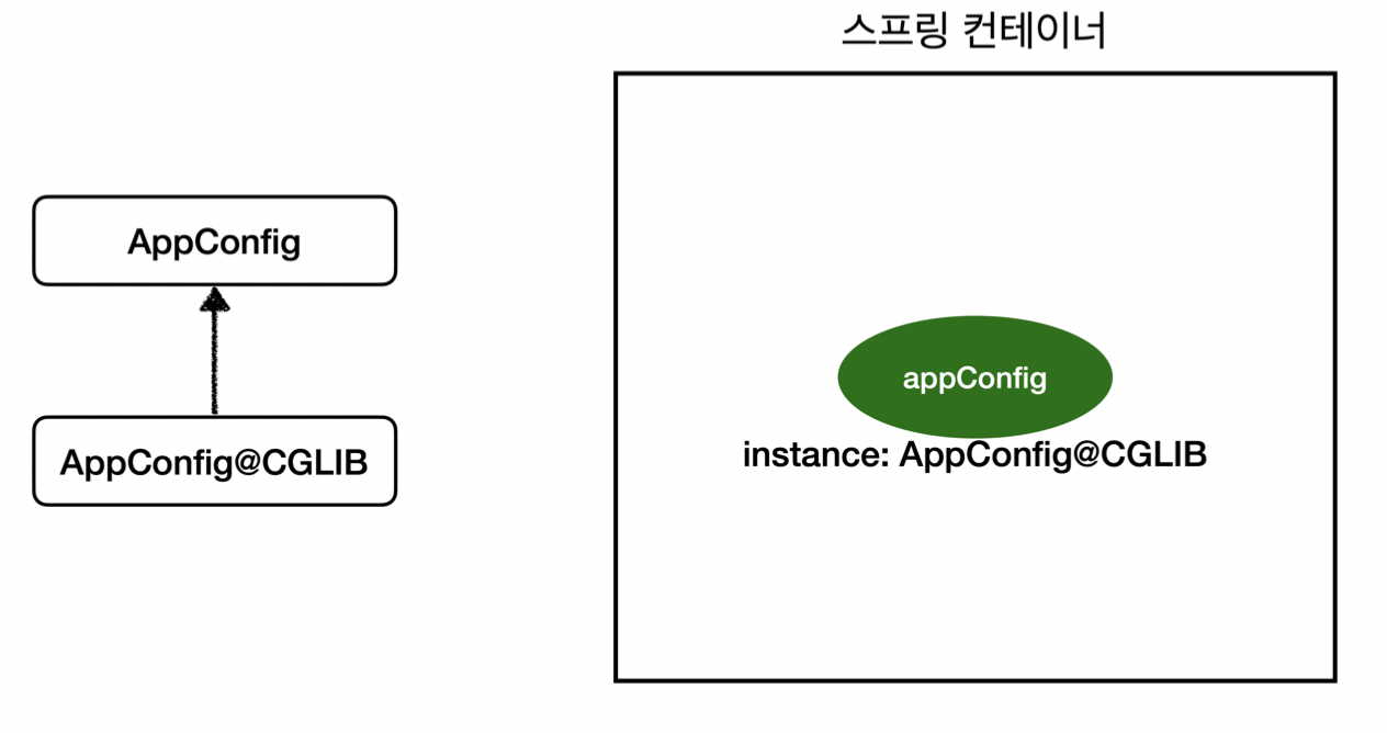 AppConfig가 CGLIB에 의해 컨테이너에 등록된 AppConfig@CGLIB 예상 코드를 보자면 아래와 같지 않을까 싶다. (실제로는 훨씬 복잡하게 구현되어있을 것이며, 이 코드는 간략한 예상 코드이다.)