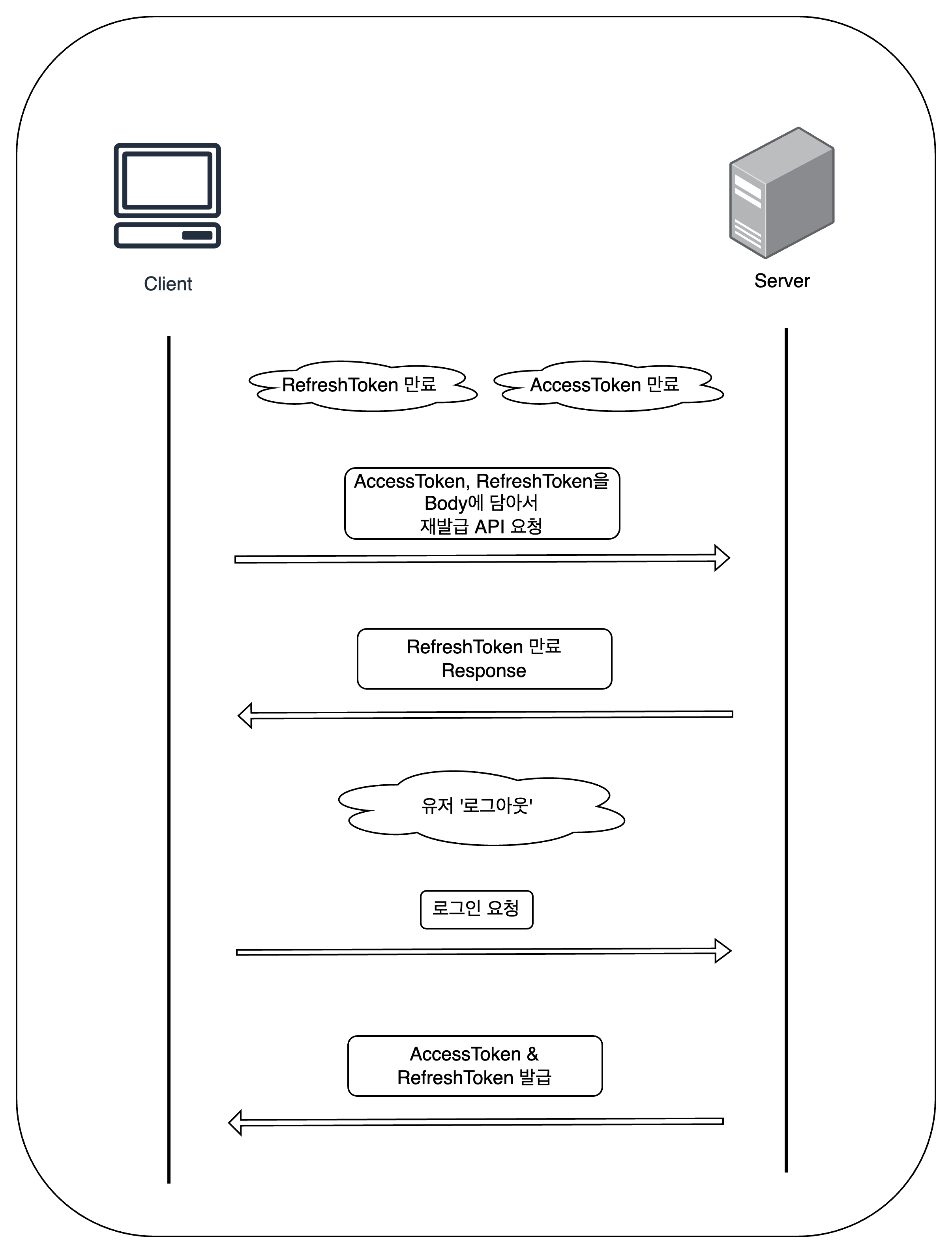 2. 클라이언트는 RefreshToken, AccessToken을 Body에 담고, 서버에 토큰 갱신 요청을 보내 만료된 AccessToken을 갱신한다.
