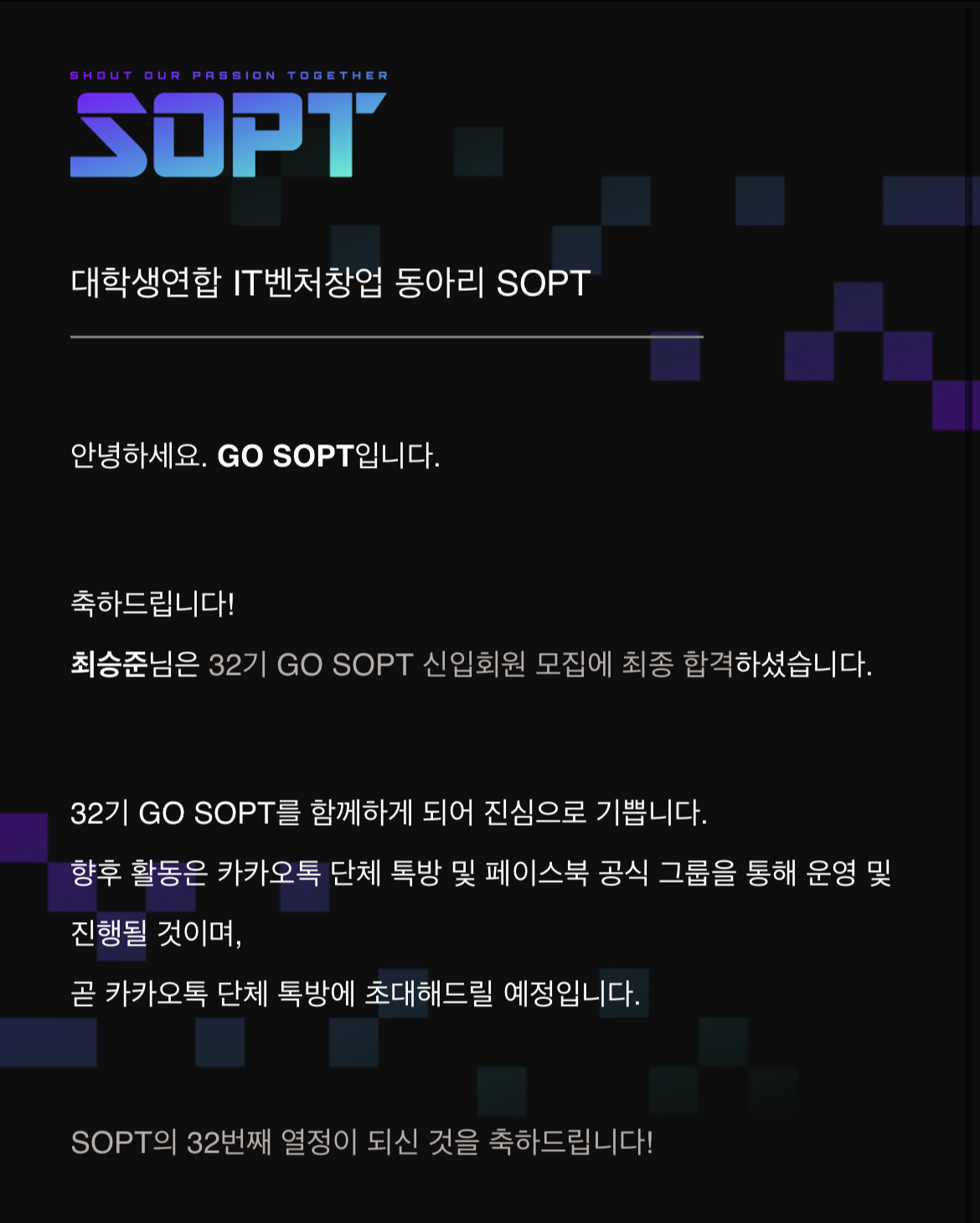 기분은 좋았지만 서류를 저장해 둔 것이 없으니 자소서에 썼던 내용들의 기억만으로 면접을 준비하게 되었다. 하지만 너무나 소중한 기회로 다가올 것 같은 이 동아리에 모든 걸 걸어보고자 여태껏 공부했던 것들을 모두 흝으며 면접을 준비했고, 덕분에 32기 서버파트에 최종 합격을 할 수 있었다.