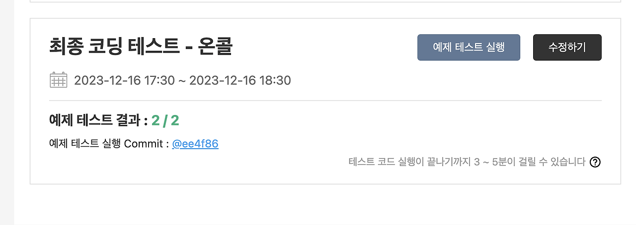 너무 기뻐서 소리 지르고 싶었지만 끝날 때까지 긴장감을 유지한 채 최대한 리팩토링을 진행했고, 기능 문서에 작성한 내용들을 꼼꼼히 체크하였으며, 마지막엔 객체의 테스트 코드를 작성하다 시간이 종료되어 제출하고 나오게 되었다.