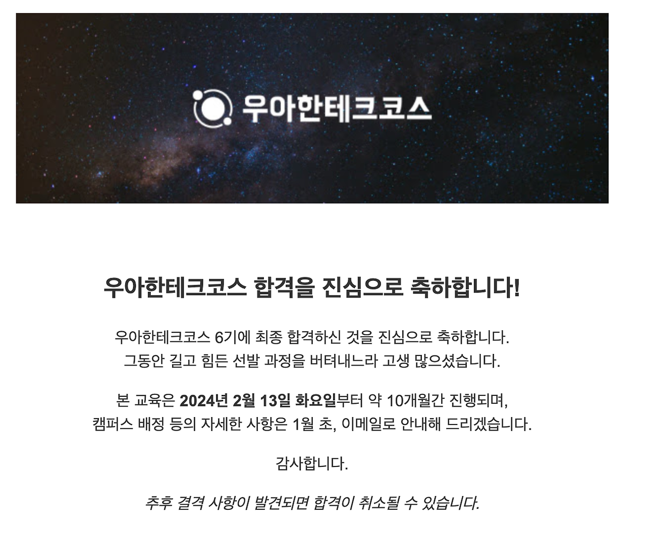 집에 돌아와 코드를 살펴보니 조금 실수한 부분이 있어 걱정이 되었지만, 정말 다행히도 12월 27일 오늘 오후 3시,, 우테코 6기에 최종 합격할 수 있었다.