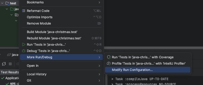 Test 패키지를 오른쪽 마우스로 클릭하고, More Run/Debug를 선택한 다음