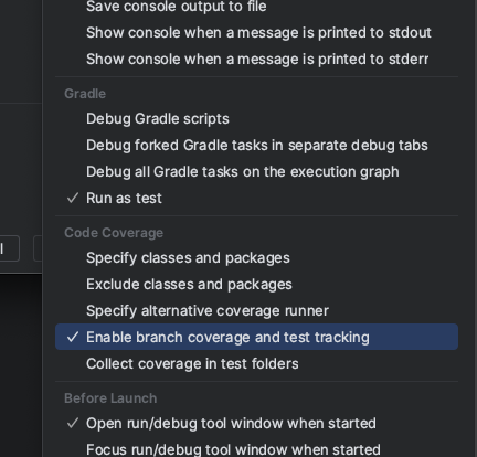 Code Coverage 탭에 있는 Enable branch coverage and test tracking을 선택한다.
