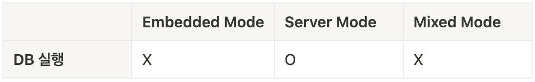 - Embedded Mode의 DB는 JVM(및 클래스 로더) 당, 단 하나만 열려있을 수 있다. 데이터베이스가 JVM의 내부에 직접 포함되어 있기 때문에 다른 JVM에서는 접근할 수 없는 것이다.