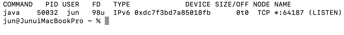 'lsof -i :PORT' 명령으로 터미널에서 조회하면 정상적으로 작동중인 DB 프로세스를 확인할 수 있다.