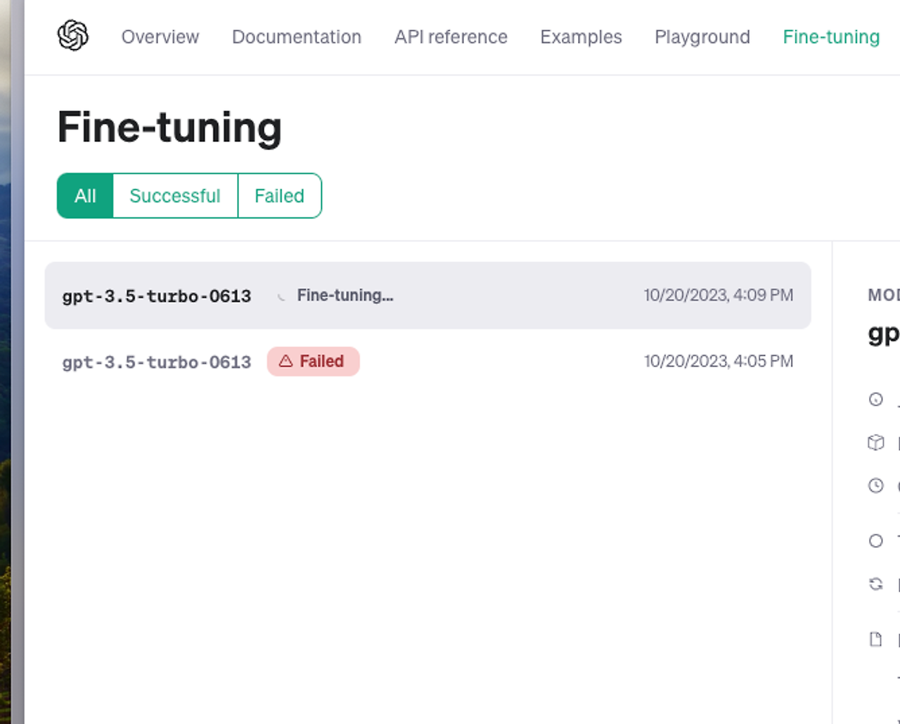 - 파인 튜닝의 진행상황은 OpenAI Playground에서 실시간 확인이 가능하다