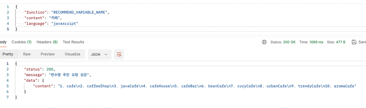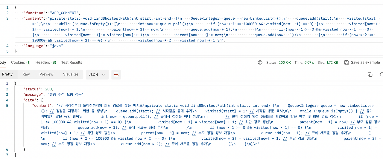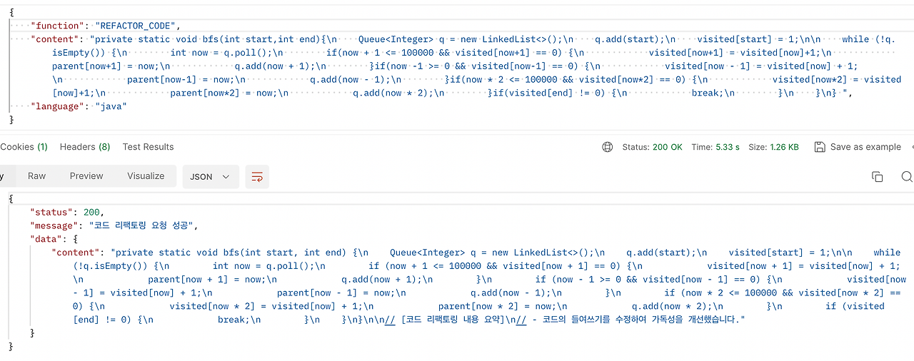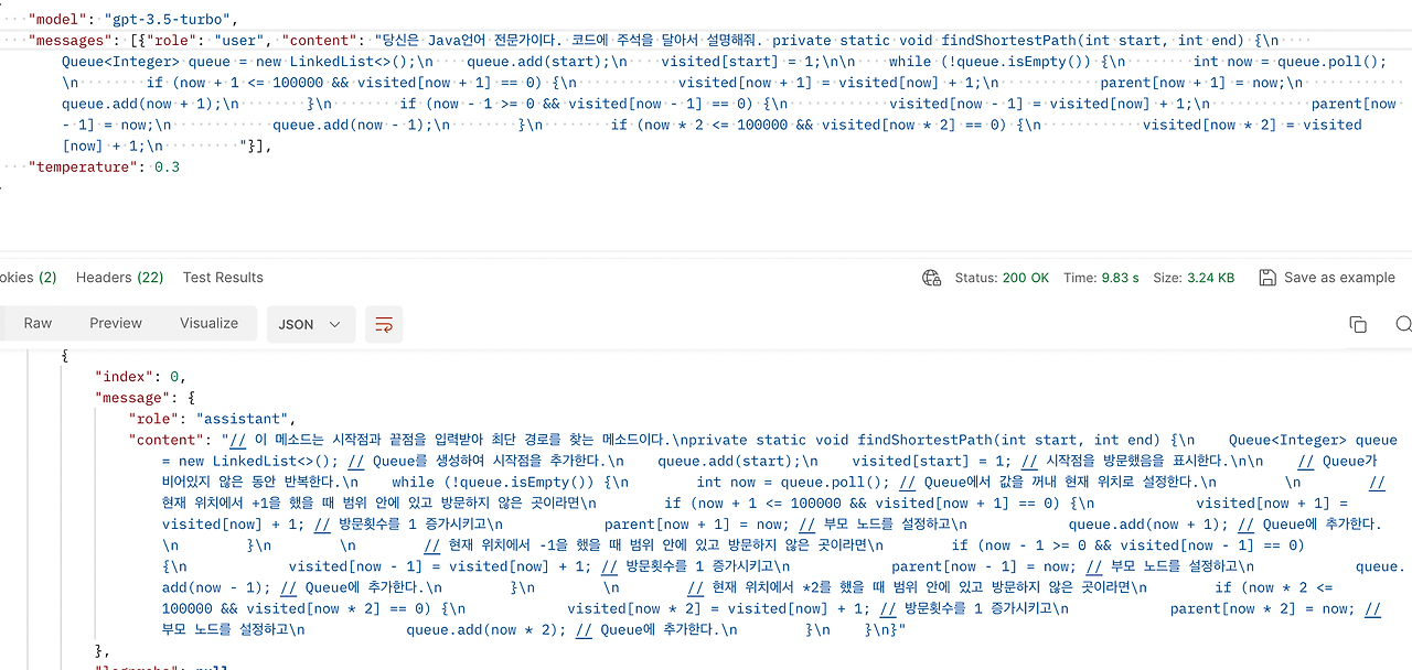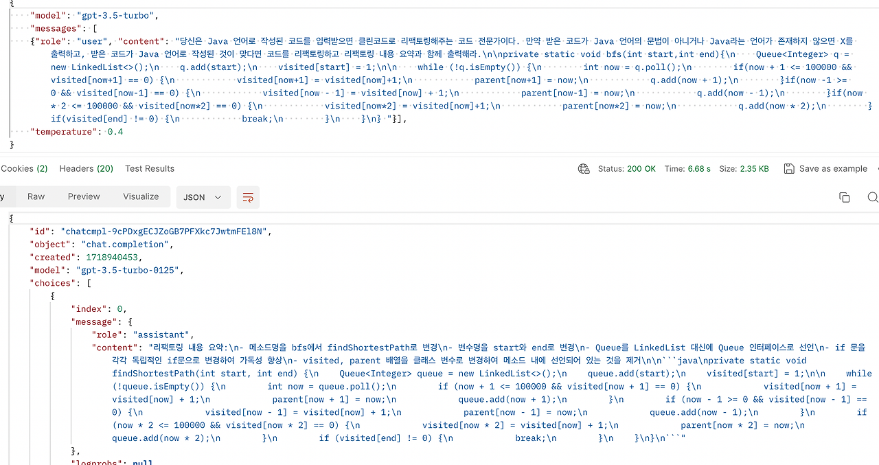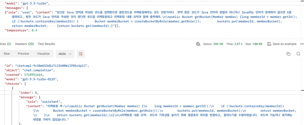 ‘코드 리팩토링’, ‘변수명 추천’, ‘주석을 통한 코드 설명’ 기능이 존재하는데, 이를 구현하기 위해 SpringBoot 환경에서 HttpClient를 사용하여 GPT API에서 제공하는 gpt-3.5-turbo 모델과 통신하여 응답 값을 얻어오는 것 까지는 성공했다.