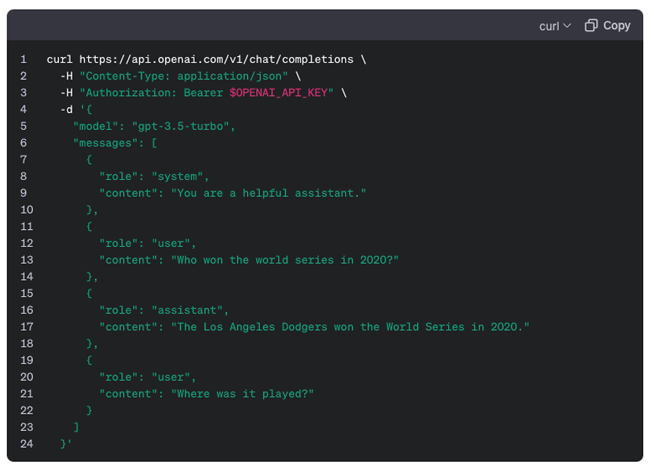 하지만 Chat Completion 방식을 통해 “그것이 어디서 진행되었나?” 라는 질문 이전 ‘2020 World Series’에 대한 대화의 문맥이 포함된 대화뭉치를 제공한다면 GPT는 훨씬 정확하고 수월한 답을 내놓을 수 있게 되는 것이다.
