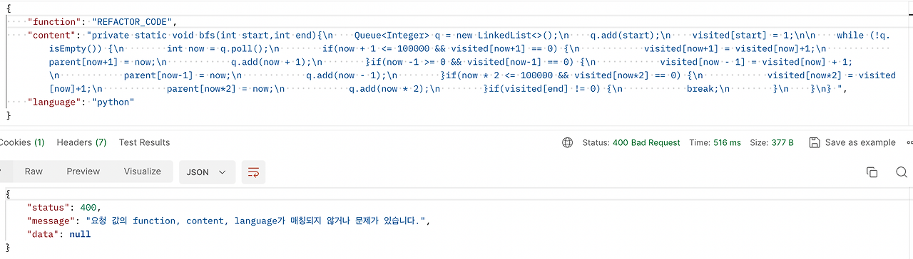 리팩토링 기능의 오류처리와 동일하게 모델을 학습하는 데이터셋에 유저가 전송한 코드와 언어가 매칭되지 않으면 서버에서는 다음과 같은 예외를 발생시키도록 구현하였다.