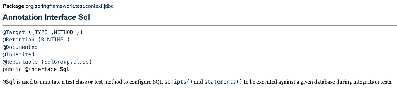 ‘@Sql 애노테이션은 통합 테스트 환경에서 주어진 데이터베이스에 실행시키기 위한 SQL의 scripts 또는 statements를 구성하기 위한 목적으로 테스트 클래스 또는 테스트 메서드에 붙여주는 애노테이션’ 이라고 한다.